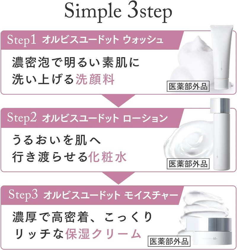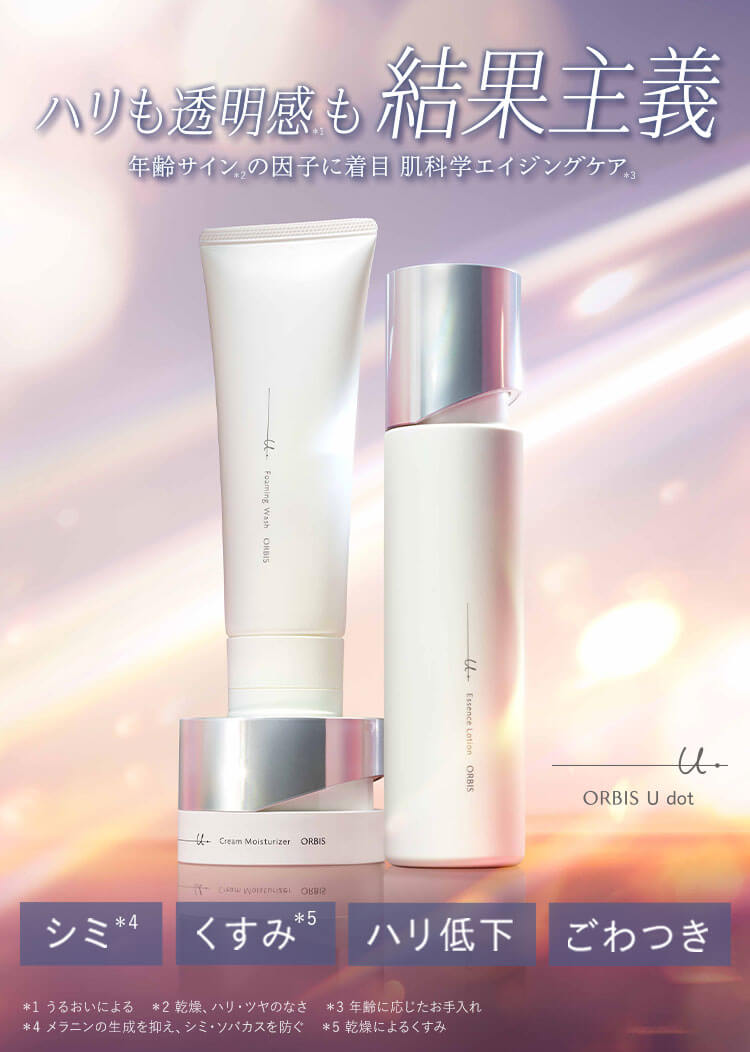ORBISユードットは年齢肌に必要な成分をバランスよく配合。とろみ化粧水と濃密クリームの組み合わせでエイジングケアと保湿ケアを両立し、肌にふっくらとしたハリと透明感をもたらします。